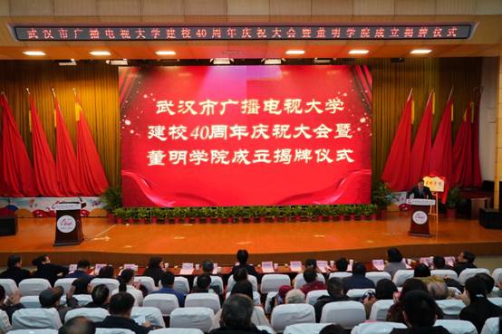 武漢分部建校40周年慶祝大會暨董明學院成立揭牌儀式舉行。國家開放大學黨委副書記、紀委書記劉向虹,武漢市人大常委會副主任胡樹華,武漢市原副市長、武漢市人大原副主任、學校老校長高順齡,共青團湖北省委副書記王云清,湖北省教育廳職成教處副處長劉長軍,武漢市總工會黨組書記、常務副主席王芳,共青團武漢市委副書記葉仁杰等出席會議。