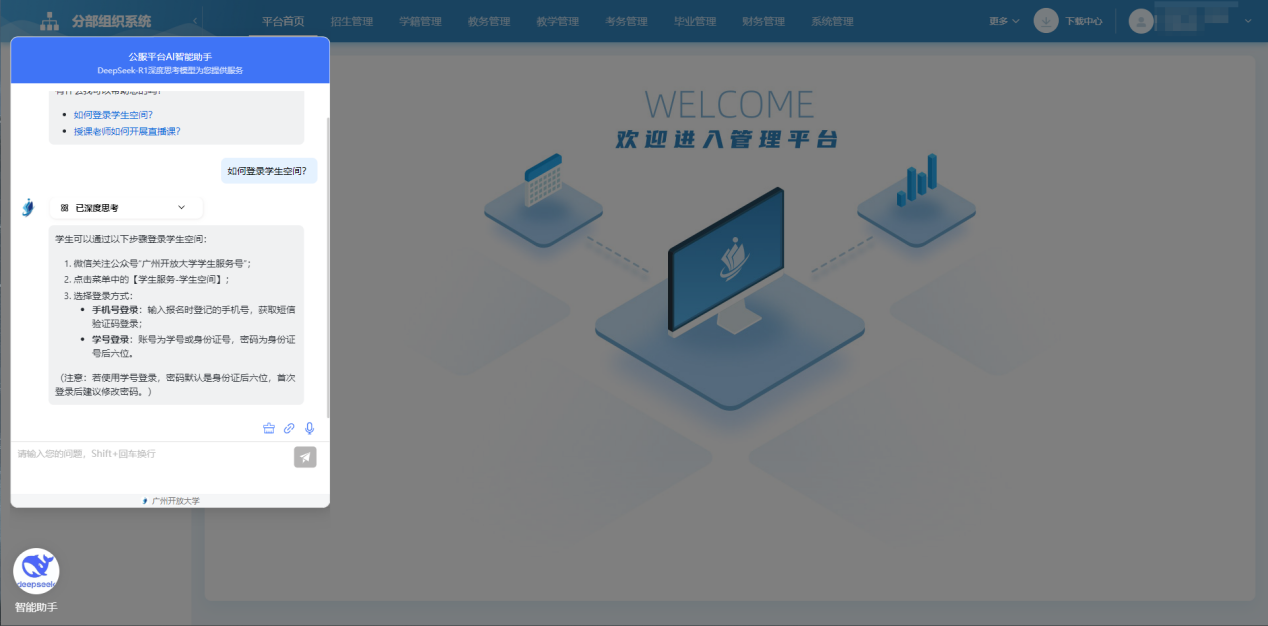 在數字化轉型與教育創新的浪潮中,廣州開放大學始終致力于探索前沿技術在教育領域的深度應用。2025年,廣州開放大學已成為全國開放大學體系中首批成功實現校內自主部署 DeepSeek 的院校之一。這一創新實踐不僅標志著我校在人工智能應用領域的重大突破,更為全校師生帶來了前所未有的智能化體驗,為校園管理與教育教學注入了強大動力。