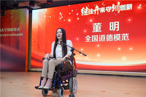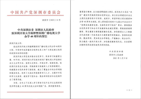 揭牌儀式上,聶新平代表市委市政府對學(xué)校40年取得的辦學(xué)成績給予了充分肯定。他指出,揭牌成立深圳開放大學(xué),在更高起點(diǎn)、更高要求上發(fā)展成人高等教育,推動(dòng)構(gòu)建服務(wù)全民終身學(xué)習(xí)的教育體系,是深圳貫徹落實(shí)十九屆五中全會(huì)精神,推進(jìn)深圳先行示范區(qū)建設(shè)的具體舉措。面向未來,希望深圳開放大學(xué)對標(biāo)世界一流,緊扣服務(wù)國家區(qū)域發(fā)展戰(zhàn)略這條主線,成為服務(wù)全民終身學(xué)習(xí)的主力軍和主陣地,努力培養(yǎng)更多更好的滿足國家、滿足深圳、滿足時(shí)代需要的人才。市委市政府將一如既往地為深圳開放大學(xué)深化改革、建設(shè)發(fā)展提供充足條件和堅(jiān)強(qiáng)保障。