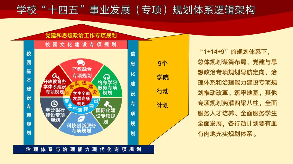 為確保“十四五”事業發展規劃落細落地,學校構建了“1個總規+14個專項規劃+9個二級學院行動計劃”的規劃體系,高質量打造事業發展目標鏈、標準鏈。“十四五”期間,學校將按照高質量發展工作布局,重點推進黨建和思想政治工作、師資隊伍建設、專業與課程建設、學生全面發展、校園文化建設、校園基本建設、治理體系與治理能力建設、信息化建設、產教融合、開放教育辦學體系建設、終身學習服務、國際化建設、科技創新服務、學分銀行建設等14個專項規劃,全力實施9個二級學院行動計劃,以學校“十四五”期間主要發展指標任務為抓手,推動“互聯網+”辦學特色鮮明的新型大學建設進入發展快車道。