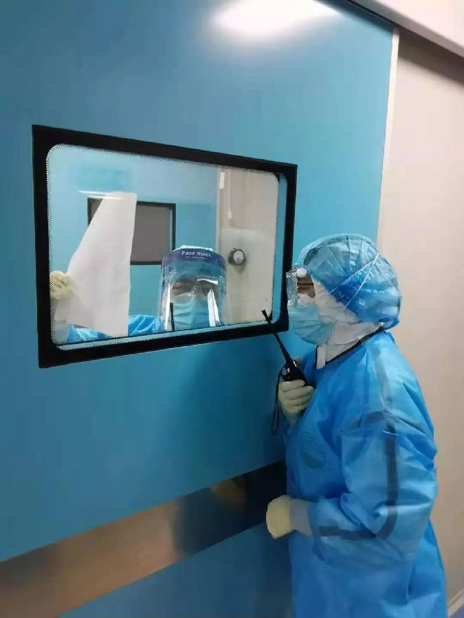 工作期間,為了減少感染風(fēng)險(xiǎn),長(zhǎng)發(fā)護(hù)士們把留了多年的長(zhǎng)發(fā)剪短。進(jìn)入隔離病房后,雖然只有一道門,但是醫(yī)護(hù)人員為了節(jié)省防護(hù)服等醫(yī)療物品,減少進(jìn)出隔離病房的次數(shù),用對(duì)講機(jī)溝通、交流工作相關(guān)事項(xiàng)。