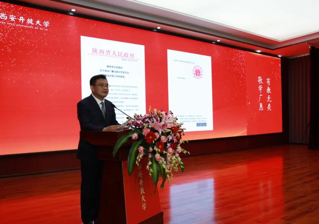王紫貴宣讀《陜西省人民政府關于西安廣播電視大學更名為西安開放大學的批復》。