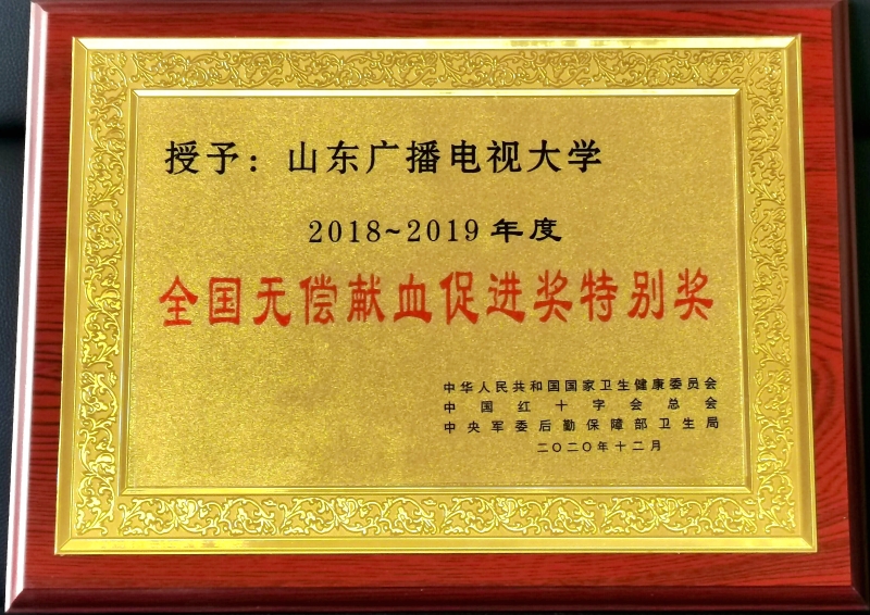 1月8日,國家衛生健康委員會、中國紅十字總會、中央軍委后勤保障部衛生局聯合組織召開2018-2019年度全國無償獻血表彰電視電話會議,山東開放大學(山東廣播電視大學)榮獲全國無償獻血促進獎特別獎,這是學校自2013年開展無償獻血公益活動以來首次獲得國家級榮譽。學校組織部副部長張永偉獲全國無償獻血奉獻獎金獎,學生處處長張明光獲全國無償獻血志愿服務二星獎,經管學院2017級學生王慧杰、2018級學生遲佳麗獲全國無償獻血志愿服務一星獎。