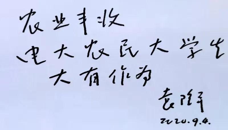 2020年9月,長沙廣播電視大學(xué)舉辦“2020中國農(nóng)民豐收節(jié)(長沙)暨第二屆長沙農(nóng)民大學(xué)生創(chuàng)新創(chuàng)業(yè)節(jié)”,袁老再次為該活動題詞鼓勵(lì):農(nóng)業(yè)豐收,電大農(nóng)民大學(xué)生大有作為!
