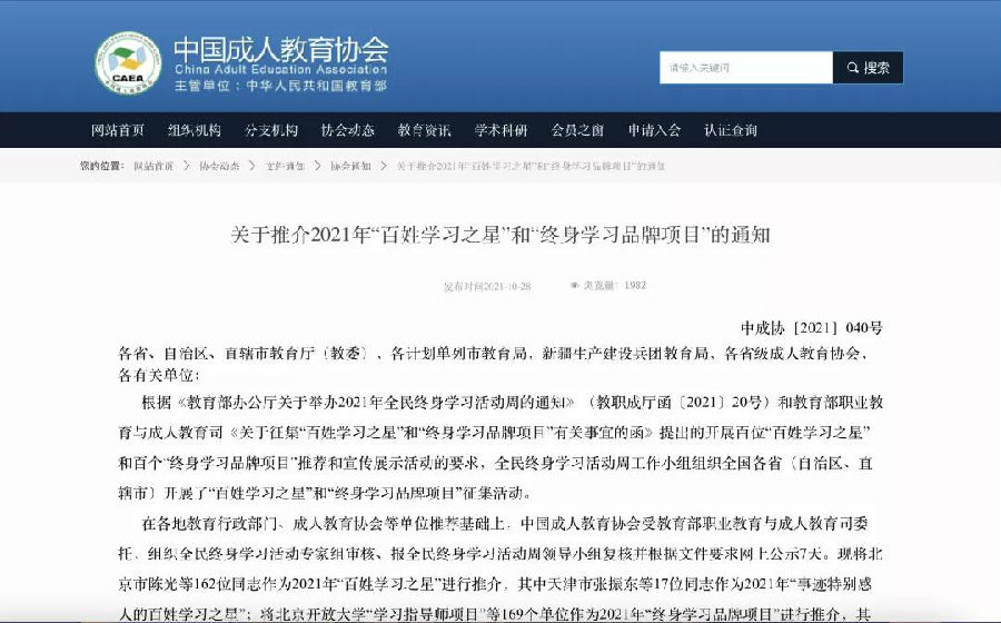 近日,中國成人教育協會受教育部辦公廳和職業教育與成人教育司委托,在各地教育行政部門、成人教育協會等單位推薦基礎上,經過全民終身學習活動周專家組審核和網上公示后正式發布了《關于推介2021年“百姓學習之星”和“終身學習品牌項目”的通知》(中成協[2021]040號)。福建省有5人被評為全國2021年“百姓學習之星”,其中,福建電大一位“爺爺學員”與一位校友榮獲“百姓學習之星”榮譽稱號。