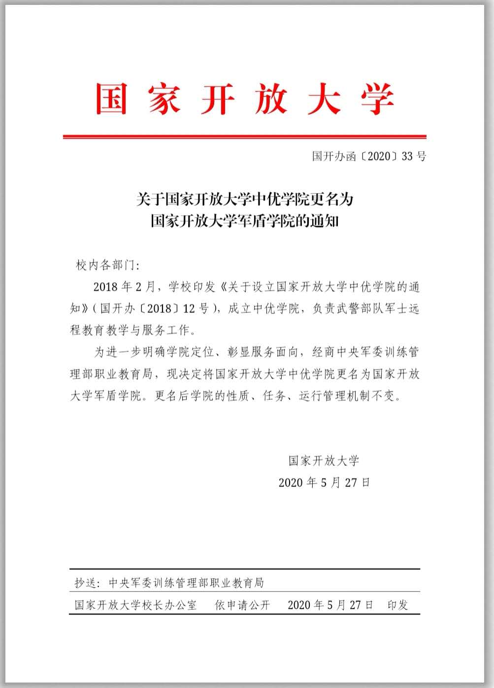 國家開放大學中優學院更名為國家開放大學軍盾學院