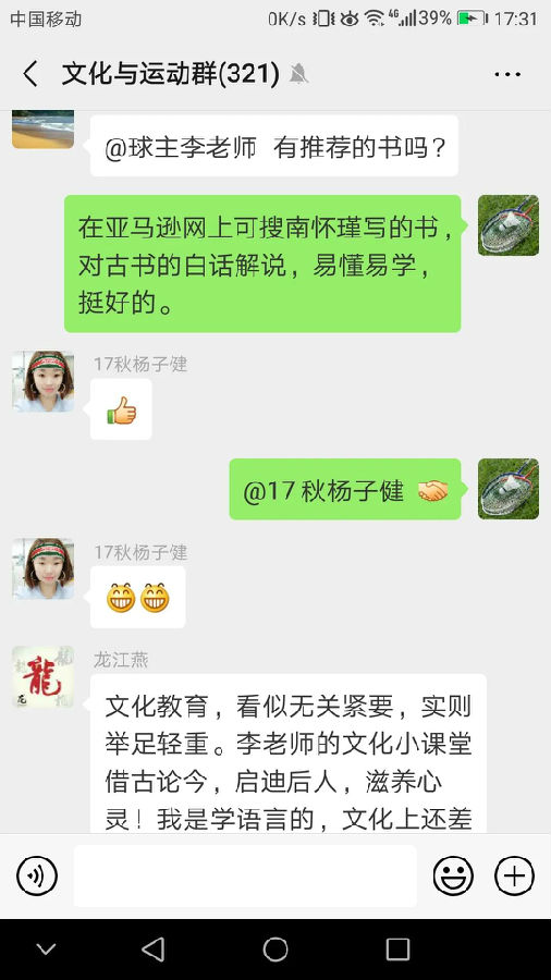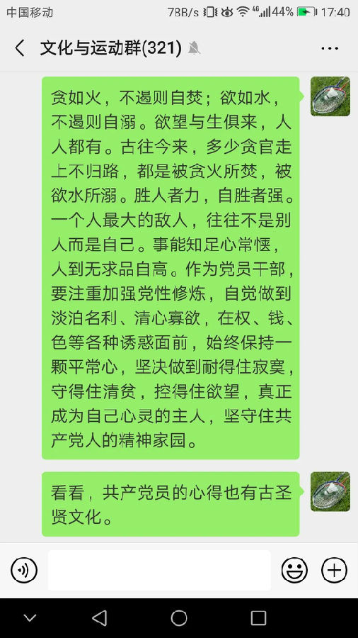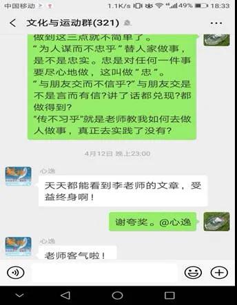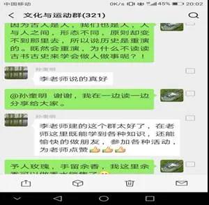 2019年3月18日分享的文章“讀古文,學做人”,告訴學員要多讀優秀的國學經典,做一名正直坦蕩無煩愁的人。學員小孫看到后感慨道,“學院建的這個文化群太好了,又能學知識,又能化解心里的困惑。”學員小路說,“最近負能量太多,看了文章,心里舒服多了”。在疫情防控期間分享的圖文“如果你沒‘他’后臺硬,就別硬闖關了”,告誡學員要認真學習習近平總書記關于疫情防控的指示精神,做好自我防護,不給國家添亂,群里的學員閱讀后一致表示要嚴格遵守防疫的各項規定,并為文化群中老師的認真負責點贊。
