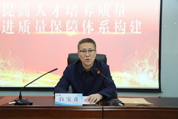 校長白寶彥從五個方面對教育教學改革取得的成績進行總結。一是堅持黨對教育工作的全面領導,構建“大思政”格局;二是弘揚教育家精神,打造高質量教師隊伍;三是強化質量保證,構建一體化建設;四是堅持以生為本,提高學生支持服務能力;五是堅持依法治校,構建高質量管理保證體系。他強調,全系統上下要牢固樹立質量是生命線的意識,同時以評估整改工作為契機,持續擔當作為,勇于爭先,共商、共建、共創、共治、共贏,形成一體化辦學新格局。