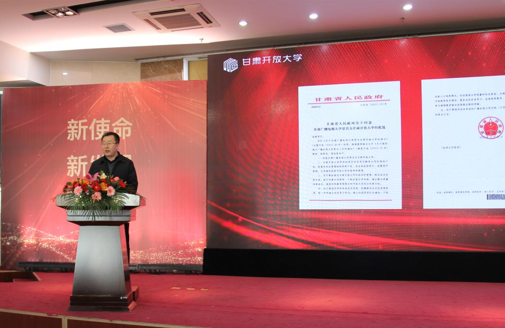 王曉陽宣讀了《甘肅省人民政府關于同意甘肅廣播電視大學更名為甘肅開放大學的批復》。張世珍、林宇共同為甘肅開放大學揭牌。