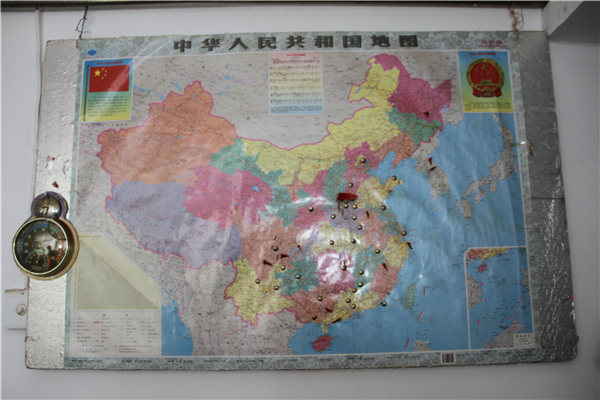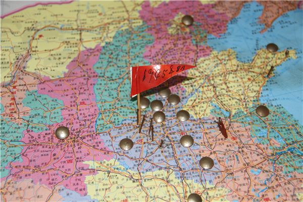 走進(jìn)陳老的家中,首先映入眼簾的是一張中國(guó)地圖,上面用釘子作為標(biāo)記,插滿了小紅旗,這是他參軍以來(lái)走過、戰(zhàn)斗過的所有地方。其中有一面最大的旗幟,地點(diǎn)是河南焦作,這是他革命開始的地方,時(shí)間是1945年8月,那年他18歲。