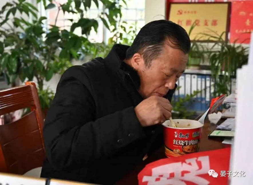 晏乃軍再次回到村部已經(jīng)過了午飯時間,其他村干部正在匯總上午走訪和疫情防控情況。晏乃軍拿起一份泡面、沖上開水:“這東西開始吃還覺得有味,頓頓吃就不香了,還是老伴做的飯菜香。”