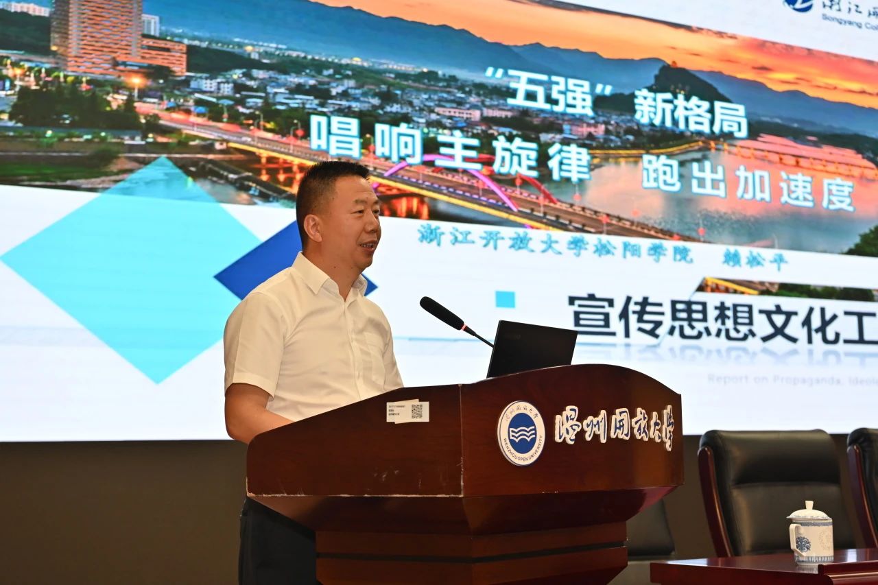 張建國指出,宣傳思想文化工作是黨的一項極端重要的工作,是我們事業(yè)發(fā)展的“根”與“魂”,是凝心鑄魂、培根固本的基礎工程。要提高政治站位,深刻認識做好新時代宣傳思想文化工作的極端重要性,深刻認識做好這項工作是事關全局、事關長遠的戰(zhàn)略任務,是推動學校事業(yè)高質(zhì)量發(fā)展的根本保障,也是全省開放大學服務國家和省域重大戰(zhàn)略的題中之義。要深刻領會習近平文化思想的核心要義與實踐要求,準確把握根本遵循;要胸懷“國之大者”和“省之要事”,深刻理解宣傳思想文化工作在服務大局中的戰(zhàn)略地位;要立足自身特色優(yōu)勢,深刻認識新時代賦予浙江開放大學的獨特使命與嶄新課題。