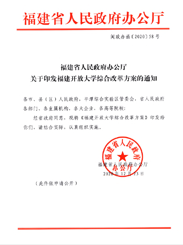 2020年12月23日,福建省人民政府辦公廳印發了《福建開放大學綜合改革方案》(以下簡稱《方案》)。