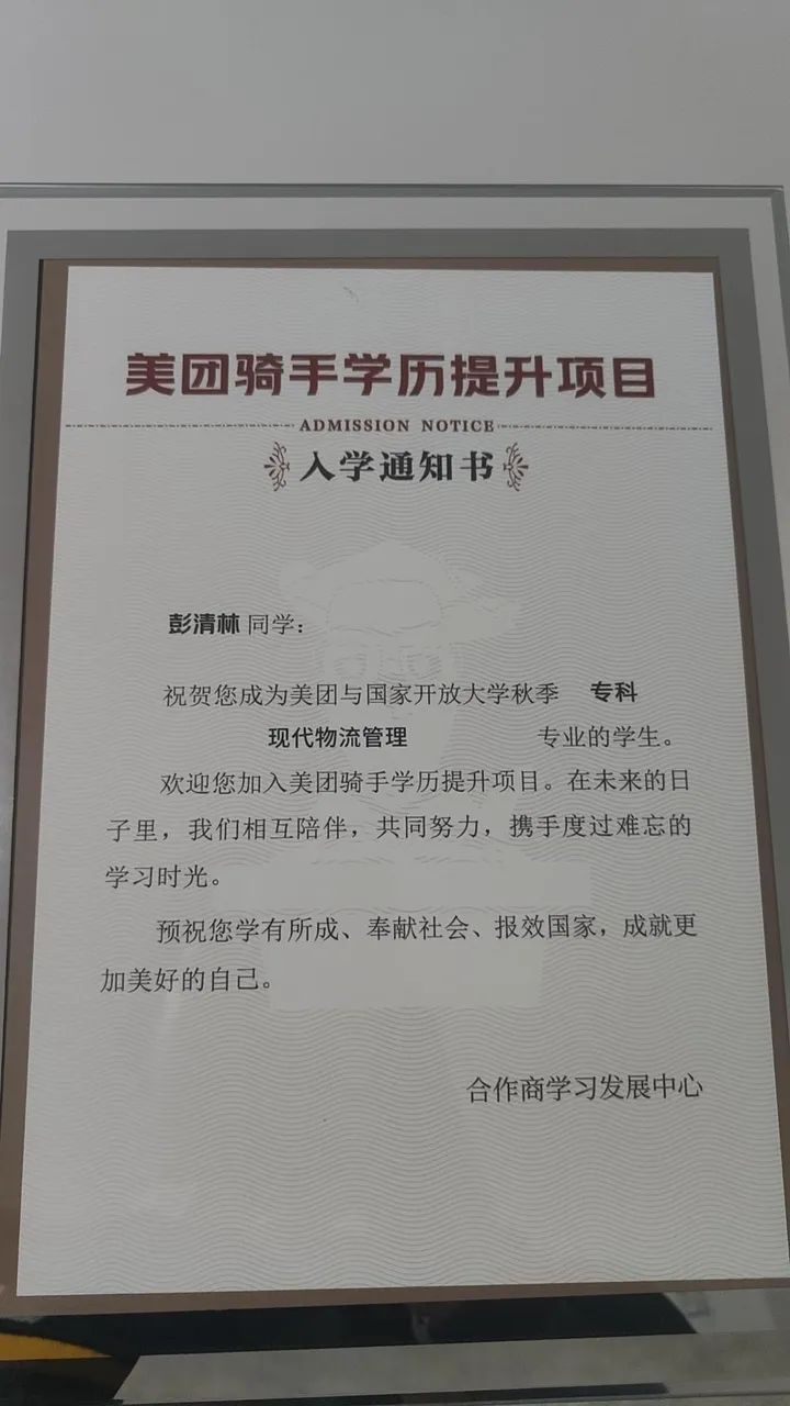 社會各界對他的褒獎紛至沓來其中就包括彭清林所在的外賣平臺與國家開放大學(xué)聯(lián)合推出的“騎手上大學(xué)”項目給予了彭清林免費上大學(xué)的機會