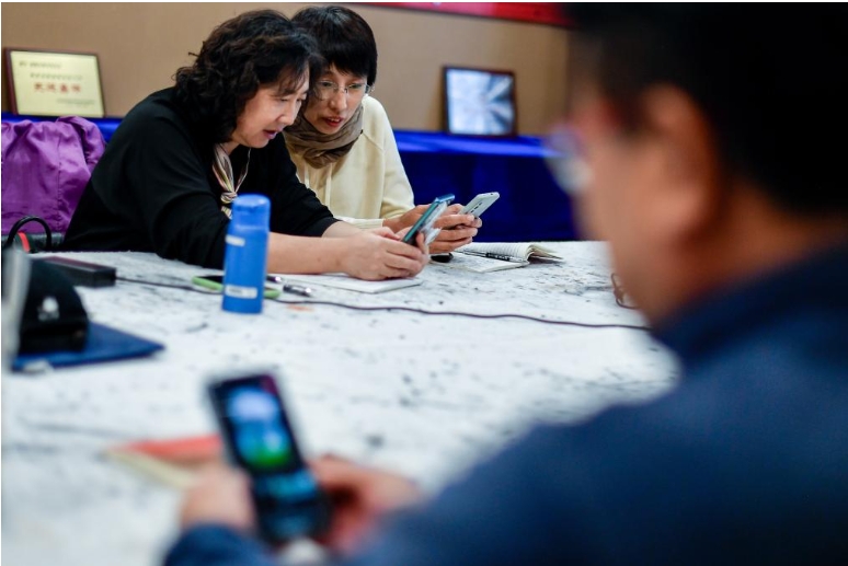 吉林省社區老年大學學員討論如何進行視頻剪輯(2023年10月30日攝)。新華社記者 許暢 攝