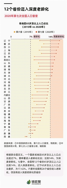 5月11日公布的第七次人口普查數據顯示,我國60歲及以上人口為26402萬人,占18.70%(其中,65歲及以上人口為19064萬人,占13.50%)。與2010年相比,上升5.44個百分點。根據第七次人口普查數據顯示,我國有12個省份已經邁入深度老齡化。