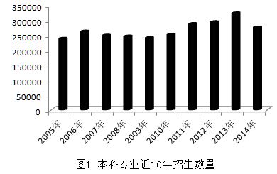 從2005年春季招生統計開始,截止目前,近10年所有本科20次招生數據分析結果得出:本科年均招生26.7萬人,2013年招生人數最多,達32.4萬人,最多招生年份為2013年,最少招生年份為2005年,最多招生年份比最少招生年份高35.5%(圖1);春秋兩季招生人數對比,除2006年和2008年,其余年份,秋季招生多于春季招生人數,秋季比春季平均高12.9%。