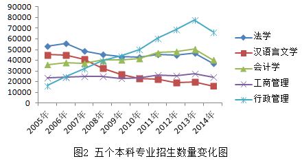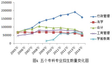 選取招生數量較多的五個專業進行縱向分析對比,法學、會計學、工商管理三個專業招生數量保持平穩,行政管理與學前教育招生數量直線上升,學前教育為2009年開始招生(圖4)。