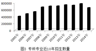 從2005年春季招生統計開始,截止目前,近10年所有專科20次招生數據分析結果得出:本科年均招生63.3萬人,2013年招生人數最多,達76.5萬人,最多招生年份為2013年,最少招生年份為2005年,最多招生年份比最少招生年份高35.5%(圖3),與本科規律驚人的一致;春秋兩季招生人數對比,除2014年以外,秋季招生均多于春季招生人數,秋季比春季平均高15.2%。