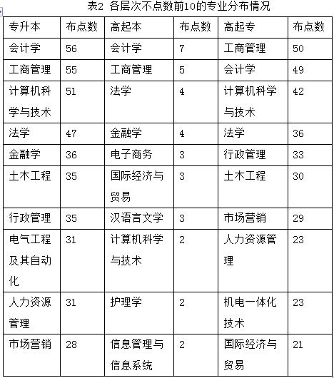 對比現代遠程教育試點高校的專業布點數前10的分布情況(表2),在本科層次,除了人力資源管理、國際經濟與貿易、信息管理與信息系統三個專業沒有開設外,其余專業也是國家開放大學招生數量較多的專業;專科層次除人力資源管理、國際經濟與貿易外,其余8個專業也是國家開放大學招生數量較多的專業。