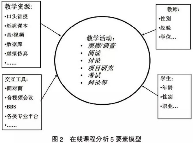 美國在線課程的首要構成要素就是教學活動。1981年第一門在線課程就是關于計算機會議系統支持的討論交流活動。筆者對中外網絡課程類別進行了分析,提出了圖2所示的在線課程分析5要素模型:
