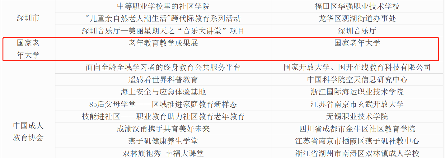 近日,中國成人教育協會發布了《關于2023年全國新時代“百姓學習之星”“終身學習品牌項目”名單公示的通知》,由國家老年大學推介的“老年教育教學成果展”成功入選2023年中國成人教育協會發布的“終身學習品牌項目”推介名單。