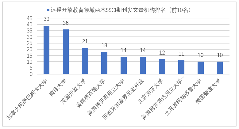 在國際學術界,情況更不樂觀。以遠程開放教育這一研究領域為例,近五年來(2016-2020年),以國家開放大學為署名單位的作者在該領域最權威、影響因子最高的兩本SSCI期刊上僅發表過1篇論文,同期加拿大阿薩巴斯卡大學39篇,南非大學36篇,英國開放大學21篇,西班牙加泰羅尼亞開放大學14篇,土耳其阿納多魯大學10篇(詳見下圖)。與世界一流開放大學相比,我校的國際學術影響力較弱。