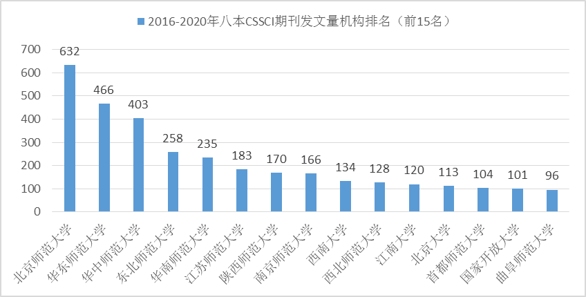 在國內學術界,我校科研成果的數量和影響力與國內一流高校相比差距明顯。以教育技術和遠程開放教育領域八本CSSCI期刊發表的論文為例,近五年來(2016-2020年),國家開放大學的發文量僅排在第14位,不足第一名北京師范大學的六分之一。詳見下圖: