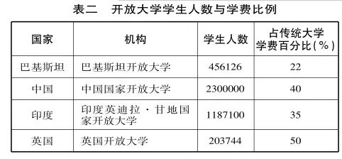 超過一千萬名學生受益于這些超級大學。通過技術擴大教育開放是開放大學進一步創新的發展。隨著超級大學的興起,規模經濟問題開始浮出水面。在一針對超級大學的研究中,我們發現,中國國家開放大學的學費是中國其他普通高校學費的40%;印度英迪拉?甘地國家開放大學的學費是其他普通高校學費的40%;而這一學費比例在巴基斯坦開放大學甚至低至22%。(見表二)