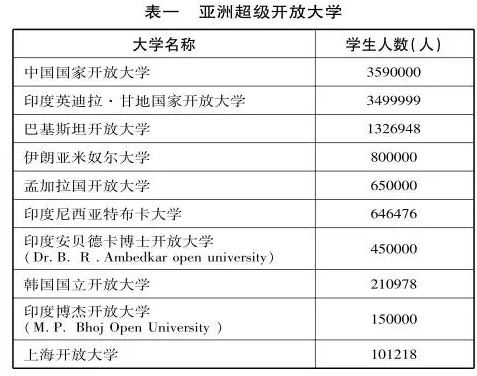 亞洲開放大學的數量居世界首位。如果我們算上各種形式的開放遠程教育機構、廣播電視大學及雙模式大學,這一數字將超過一千(見表一)。