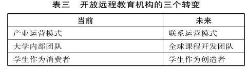 開放教育資源的發展預示著開放遠程教育機構將發生三個改變。傳統上,開放大學采用產業模式,未來的開放大學將是一種相互聯系的模式。以前,開放大學內部有課程開發團隊負責開發課程內容,現在課程團隊分散在全球各地,采用或改編現有的開放教育資源。開放教育資源的發展將會鼓勵學生成為學習內容的創造者,而不是消費者(見表三)。