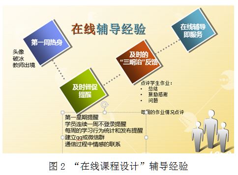 (1)為教師提供預(yù)設(shè)的輔導(dǎo)經(jīng)驗(yàn)和策略。在“在線課程設(shè)計(jì)”最初的教學(xué)實(shí)踐過程,課程組發(fā)現(xiàn),同樣的在線課程內(nèi)容,不同教師帶出來的效果很不相同。課程的教學(xué)出現(xiàn)了過度依賴輔導(dǎo)教師個(gè)人責(zé)任心和經(jīng)驗(yàn)。主要原因是課程沒有為輔導(dǎo)教師提供基本的輔導(dǎo)規(guī)范和指南、為此,課程組總結(jié)了一些有效的輔導(dǎo)經(jīng)驗(yàn)和策略,召集教師團(tuán)隊(duì)進(jìn)行了現(xiàn)場交流。為教師提供預(yù)設(shè)的輔導(dǎo)經(jīng)驗(yàn)和策略,目標(biāo)是幫助教師對課程有一個(gè)整體的輔導(dǎo)方案,為學(xué)生提供主動的、循循善誘、層層深入的指導(dǎo),而不是學(xué)生問了問題才去回答,這種被動的輔導(dǎo)不能帶來好的教學(xué)效果。圖2所示,是課程總結(jié)的輔導(dǎo)經(jīng)驗(yàn),它尤其重視課程前期的熱身和關(guān)鍵時(shí)期的提醒,重視對學(xué)生作業(yè)的及時(shí)的“三明治”反饋。