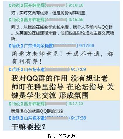在是否為學生開通統一的學生QQ群的問題上,團隊成員出現了較大的分歧。有的成員認為應該開通,有的成員則反對。那么,這個時候,該如何有效解決分歧呢?我采用的方法就是暢所欲言,然后民主投票。要給每一位想發言的成員表達看法的機會,然后在QQ群內通過投票做出決定。在團隊成員充分表達見解后,我在QQ群設計了一個關于是否開通學生QQ群的投票活動。投票結果顯示,多數成員不贊成為學生開通統一的QQ群,主要觀點就是這樣的實時交流特別耗費老師們的精力,而且學生可能會舍棄論壇,在QQ群提問題,可能會出現失控的局面。通過民主投票,團隊決定不開通統一的學生QQ群,但是我們會加強通過論壇、郵件以及平臺站內信等進行的輔導與師生互動。這樣,我們有效地解決了這個分歧,并且保持了團隊的團結。
