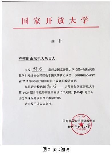 此外,要努力為大家提供各種學習與發展的機會。比如,為了爭取讓團隊更多成員參加國家開放大學組織的骨干教師高級研修班,我通過努力,向山東廣播電視大學發了公函,邀請團隊成員楊潔老師參加研修班,為老師們創造學習和培訓的機會,見圖3。