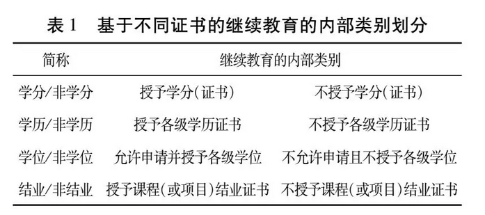 (1)從不同學習內容及結果的角度,可以將繼續教育分為有證書的繼續教育和無證書的繼續教育(簡稱證書/非證書)兩類。有證書的繼續教育又可以根據學習者獲得的證書的不同進行細分,大的劃分可以籠統地歸結為兩大類,即學歷繼續教育和非學歷繼續教育,往小往細了分,又有許多具體類別(參見表1)。