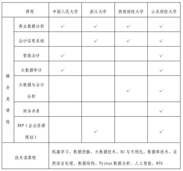 對于國內院校所開設的課程分析中可以看出,除了傳統的會計課程以外,這些高校還開設了技術類課程及融合類課程。技術類的課程相對來說開設得很全面,對于融合類的課程多數院校處于起步摸索階段。多數院校只開設了三門以內的融合類課程,且課程基本與企業共建完成。具體情況見表3。