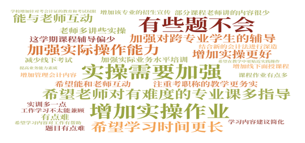 對于現有專業存在的問題和建議方面,雖然大部分的學生為在崗在職學生,但是依舊希望能夠增加會計實操技能的培養(見圖5)。