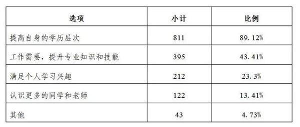 根據調研結果發現,開放大學學生雖然絕大多數的學習目的依然為提高自身的學歷層次(89.12%),但是也有越來越多的學生是基于工作需要,為了提升專業知識和技能(43.41%)從而進入開大進行學習。通過對教學班主任的訪談,發現會計學專業的學生的職業規劃、學習態度和持續力等都在開放教育各專業的前列。具體情況見表1。