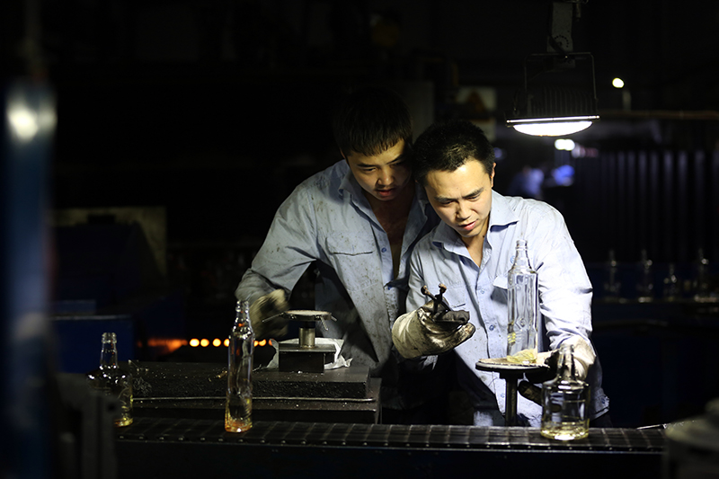 半夜12點多,路過車間的時候轟鳴聲吸引我走了進去,正好見到了兩位師傅在討論產(chǎn)品。對于玻瓶的給料、壁厚、成型他們似乎有些分歧,機器運行的轟隆讓我聽不見他們的談話內(nèi)容,但他們一絲不茍、精益求精的工匠精神讓我不自覺的拿起手中的相機記錄下了這一刻,世上所有美好的事物都是靠我們辛勤的勞動創(chuàng)造的。