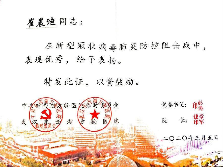 在武漢方艙醫(yī)院的42個(gè)日日夜夜,她每天都在忙碌中度過,裹著密不透風(fēng)的防護(hù)服,穿梭在病房中,解答患者問題,幫患者排憂解難,帶領(lǐng)患者跳新疆舞消除焦慮情緒……每當(dāng)患者們得知她是從新疆來的時(shí)候,總會(huì)很抱歉地說道:“新疆那么遠(yuǎn)都來幫助我們,武漢給全國(guó)人民添麻煩了。”而崔晨迪也總會(huì)安慰他們:“全國(guó)各族人民一家親,一方有難,八方支援,只要你們好,我們就好!”崔晨迪和同事們每天都在與時(shí)間賽跑,與病毒做斗爭(zhēng),和死神搶人,終于不辱使命,戰(zhàn)勝了病毒,順利完成了任務(wù)。
