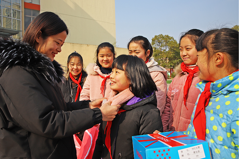 暖冬大禮包,送給留守娃。2019年1月16日,安徽省全椒縣婦聯(lián)、團(tuán)縣委聯(lián)合安徽博愛(ài)公益基金會(huì),為全縣近百名留守兒童送上暖冬大禮包,志愿者們現(xiàn)場(chǎng)為孩子們穿上棉衣、鞋子等,讓留守兒童感受來(lái)自社會(huì)的溫暖。圖為活動(dòng)現(xiàn)場(chǎng),全椒縣江海小學(xué)青年志愿者老師為留守兒童戴上暖冬大禮包中的圍巾。