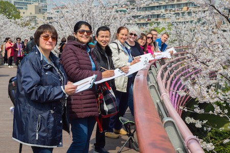 3月23日,寧波社區大學紅牡丹學院組織十余位外籍學員赴中山路上的櫻花公園繪畫寫生。