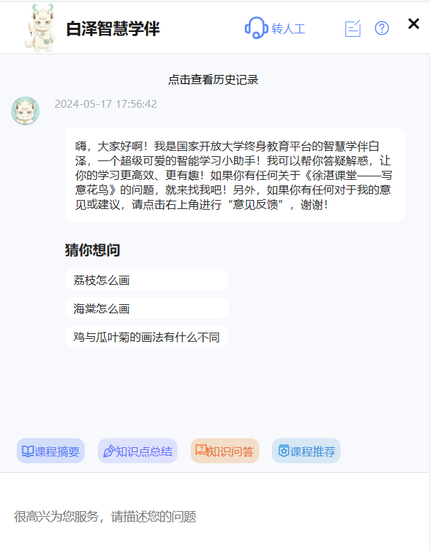 以國家開放大學AI基座為智能服務底座,并全新接入DeepSeek深度思考模型,終身教育平臺智慧學伴“白澤”能夠和學習者進行交互式對話,幫助學習者快速把握課程精髓,針對性地解決學習中的疑問,并根據個人學習進度和興趣推薦合適的課程,提升學習效率和質量。
