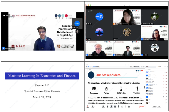 此次研修班歷時5天,主題為“數字時代的教師素養”,研修班采取主題報告+小組討論的方式進行。五場主題報告的內容為金融與經濟學中的機器學習(Machine Learning in Finance and Economics)、數字時代的對話教學(Dialogic education for the internet age)、利用教育技術實現協作學習的人工智能(AI for collaborative learning with education)、沉浸式技術—未來學習平臺設計(Immersive Technology–Future of Platforms for Learning)、數字基礎設施賦能教學和研究—以數字人文為例(Digital infrastructure enabled teaching and research-the case of digital humanities)。來自北京大學、劍橋大學教育數字化領域的專家深度解讀了機器學習、沉浸式技術等數字技術給教育帶來的深刻變革及未來發展趨勢,探討了如何在互聯網時代推行“蘇格拉底式”的對話式教育,如何利用人工智能技術來促進學生之間的協作學習及教師與學生之間的互動交流。