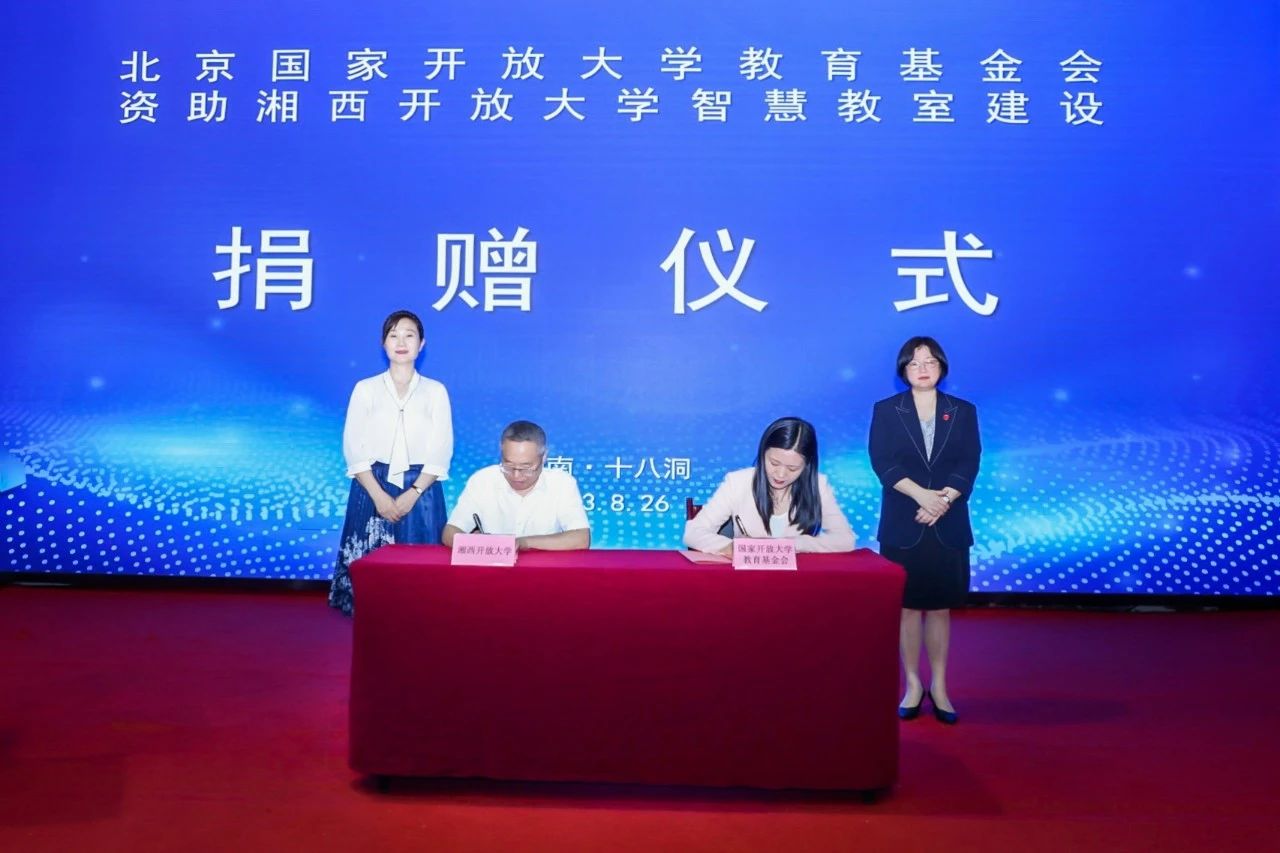 8月26日,北京國家開放大學(xué)教育基金會資助湘西開放大學(xué)智慧教室建設(shè)捐贈儀式在湖南湘西十八洞村舉行。北京國家開放大學(xué)教育基金會秘書長鄭潔與湘西開放大學(xué)黨委書記肖明安簽署了捐贈協(xié)議書。國家開放大學(xué)黨委委員、副校長范賢睿及湖南開放大學(xué)黨委副書記、校長楊斌共同見證。