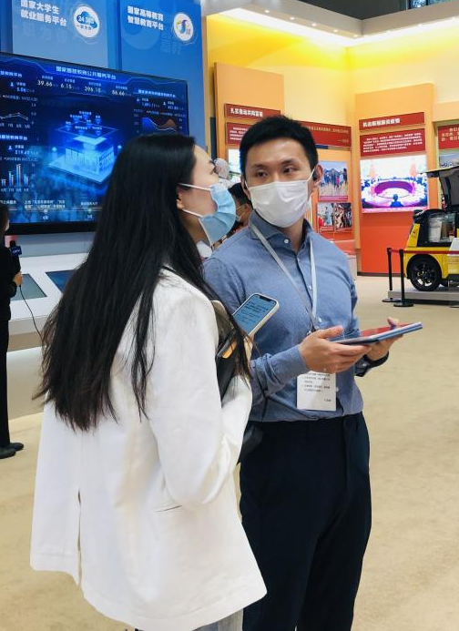 “奮進(jìn)新時(shí)代”主題成就展上周翔(右)向媒體記者介紹教育展區(qū)