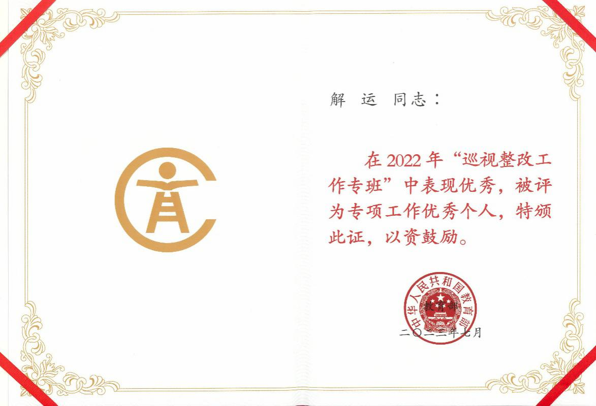 國(guó)家開放大學(xué)宣傳部解運(yùn),因在2022年“巡視整改工作專班”中表現(xiàn)優(yōu)秀,被教育部評(píng)為專項(xiàng)工作優(yōu)秀個(gè)人。