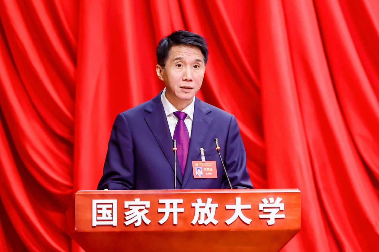 王啟明代表中國共產黨國家開放大學第一屆委員會作題為《勇擔使命 踔厲奮發——奮力譜寫中國特色世界一流開放大學高質量發展新篇章》的報告。