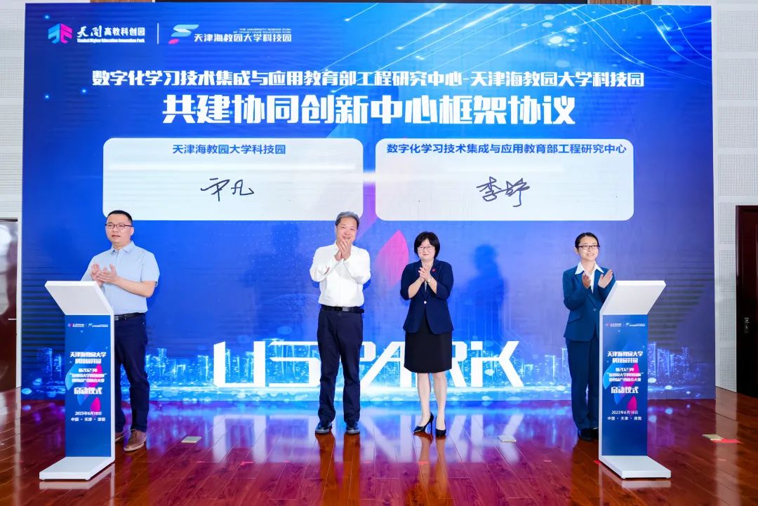 為深入實施科教興國戰略、人才強國戰略、創新驅動發展戰略,加快推進職普融通、產教融合、科教融匯,6月18日,國家開放大學黨委委員、副校長范賢睿率隊參加天津海教園大學科技園開園儀式,并與天津開放大學黨委副書記、校長張宗旺共同見證數字化學習技術集成與應用教育部工程研究中心(以下簡稱“工程中心”)與天津海教園大學科技園共建“數字化學習技術集成與應用協同創新中心”框架協議簽署儀式。學校改革發展部、工程中心相關負責人及研究人員代表參加此次活動。