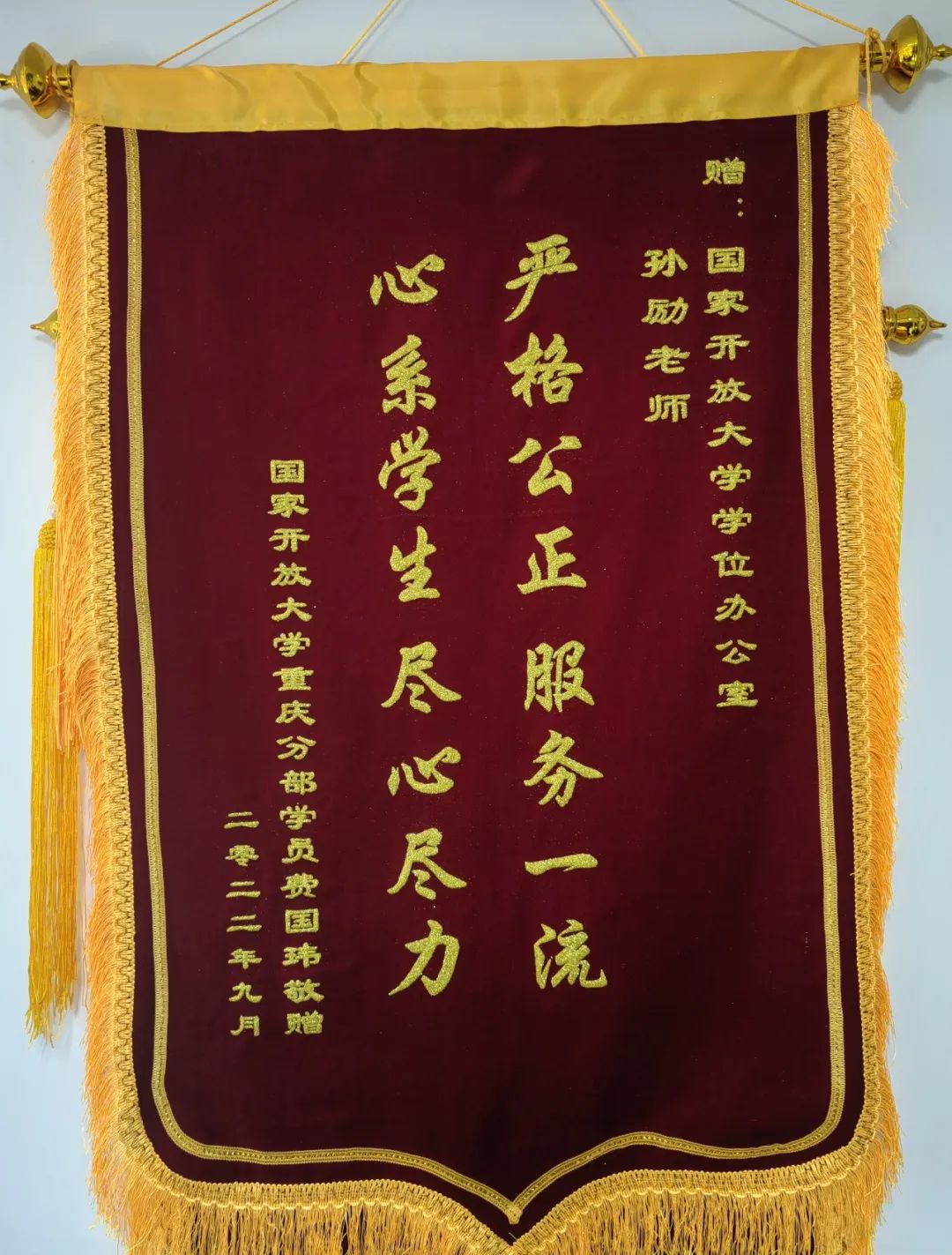 近日,一面寫著“嚴格公正、服務一流、心系學生、盡心盡力”的錦旗,由重慶分部遠程教育中心轉送到了國家開放大學教務部。錦旗由重慶分部的費國瑋同學所送,她非常感謝母校能夠及時處理她的學位證書問題,為表示感謝,特送上錦旗,以表心意。